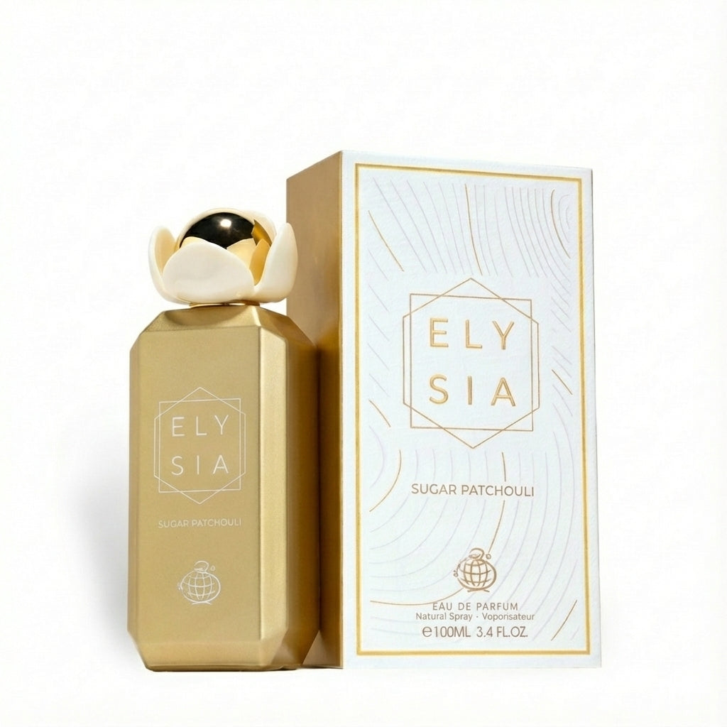 Fragrance World's Elysia Sugar Patchouli, a creamy sweetness with a heady tone, deep patchouli woods, a blend of delicate florals and a bold, seductive allure that will leave you breathless. The amber hue infuses the fragrance with an air of mystery, adding a luminous air of exotic royal oud that intensifies the drydown.